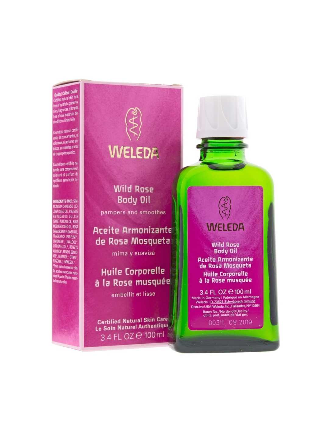 Weleda aceite corporal de rosa mosqueta junto a un masaje cotidiano favorece la tonicidad, la suavidad y la flexibilidad de la piel acompañado de un suave aroma.