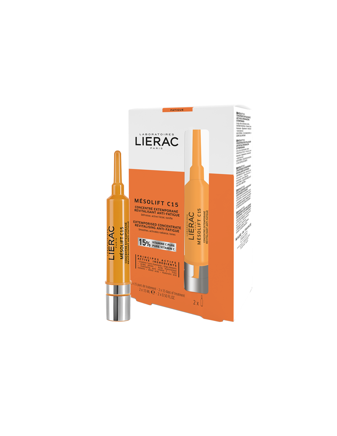 Inspirado en la técnica estética de la mesoterapia facial, el concentrado MESOLIFT C15 es un tratamiento diario recomendado durante períodos de estrés, fatiga o cambios estacionales. Es la forma perfecta de combatir el agotamiento de la piel. Una dosis óptima de 15% de vitamina C pura extemporánea, cuya misión es neutralizar las toxinas y los radicales libres que apagan el tono del cutis, a la vez que estimula la síntesis de colágeno para mejorar la tonacidad de la piel. Un complejo de oligoelementos estimula la renovación celular de la piel, mientras que los aminoácidos y el ácido hialurónico restauran su hidratación y su aspecto flexible y relleno. Los Laboratorios LIERAC han desarrollado una fórmula extemporánea que se activa en el primer uso. Esta tecnología preserva la frescura y eficacia de una alta concentración de vitamina C pura hasta que se libera en la mezcla, que está enriquecida con aminoácidos, oligoelementos y ácido hialurónico.