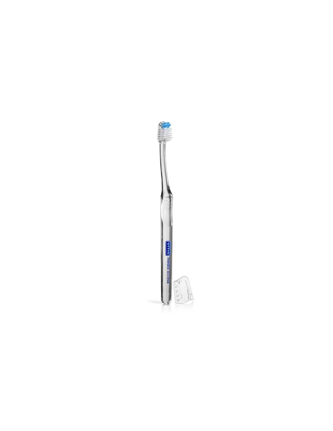 Filamentos ondulados y con dureza media para seguir la forma de las encías. Su cuello maleable lo convierte en el cepillo que mejor se adapta a la cavidad bucal.