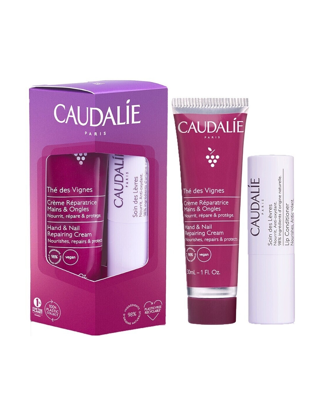 El Kit Dúo de Caudalie dispone de un bálsamo para los labios y una crema para las manos y las uñas. El bálsamo labial tiene la finalidad de reparar e hidratar los labios. Actúa como una base fijadora. Cuenta con un toque ligero avainillado. La crema para las manos está especialmente diseñada para hidratar. Tiene un suave y agradable aroma perfumado con notas de neroli, jengibre y almizcle blanco.