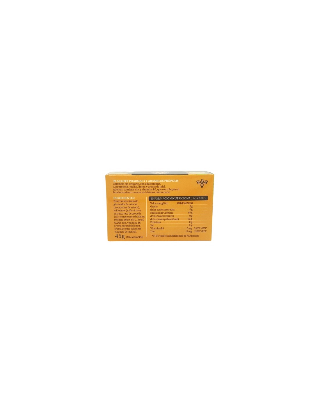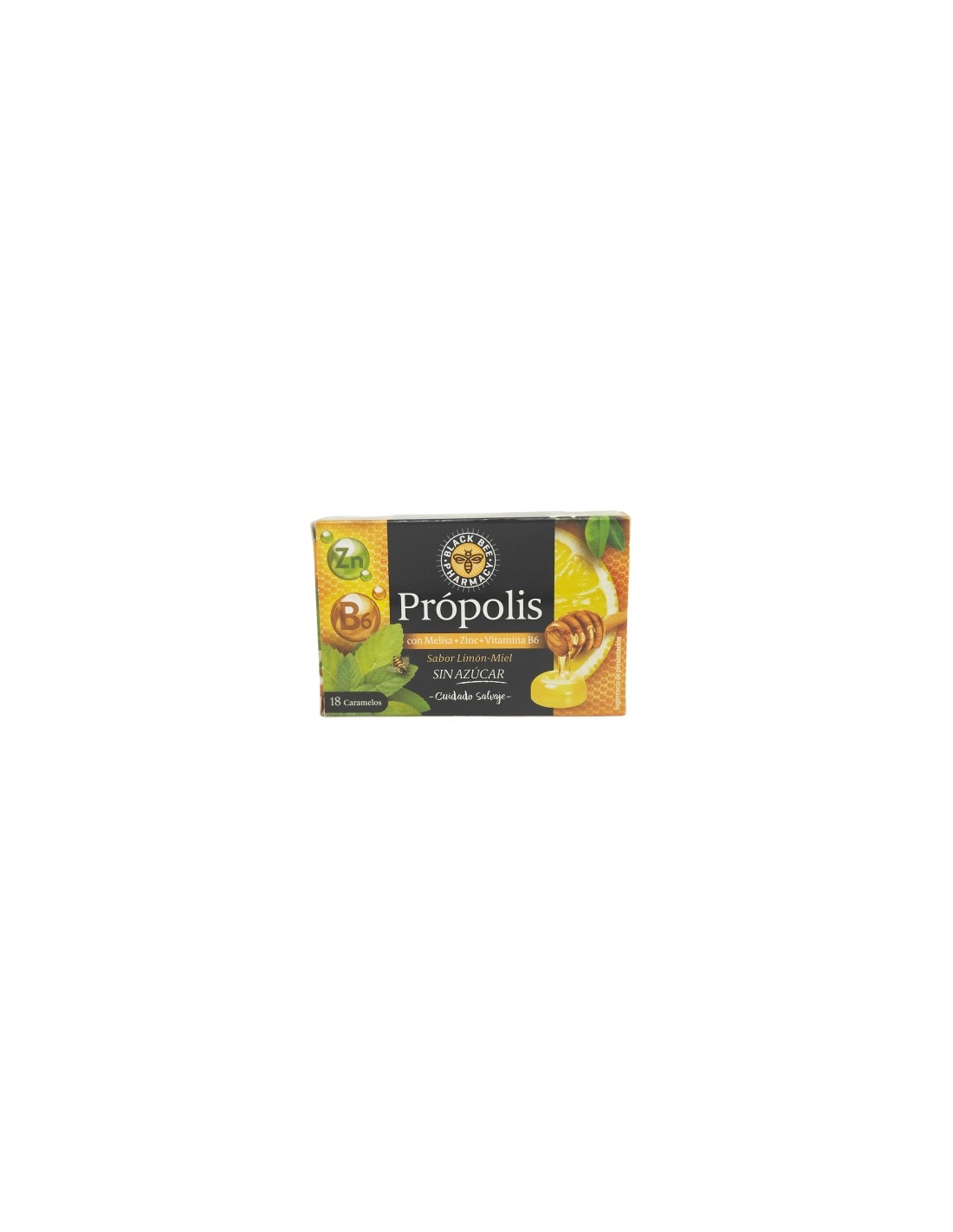 Caramelo sin azúcares, con edulcorantes, con própolis, melisa, limón t aroma de miel. Además, contiene Zinc y vitamina B6, que contribuyen al funcionamiento normal del sistema inmunitario.