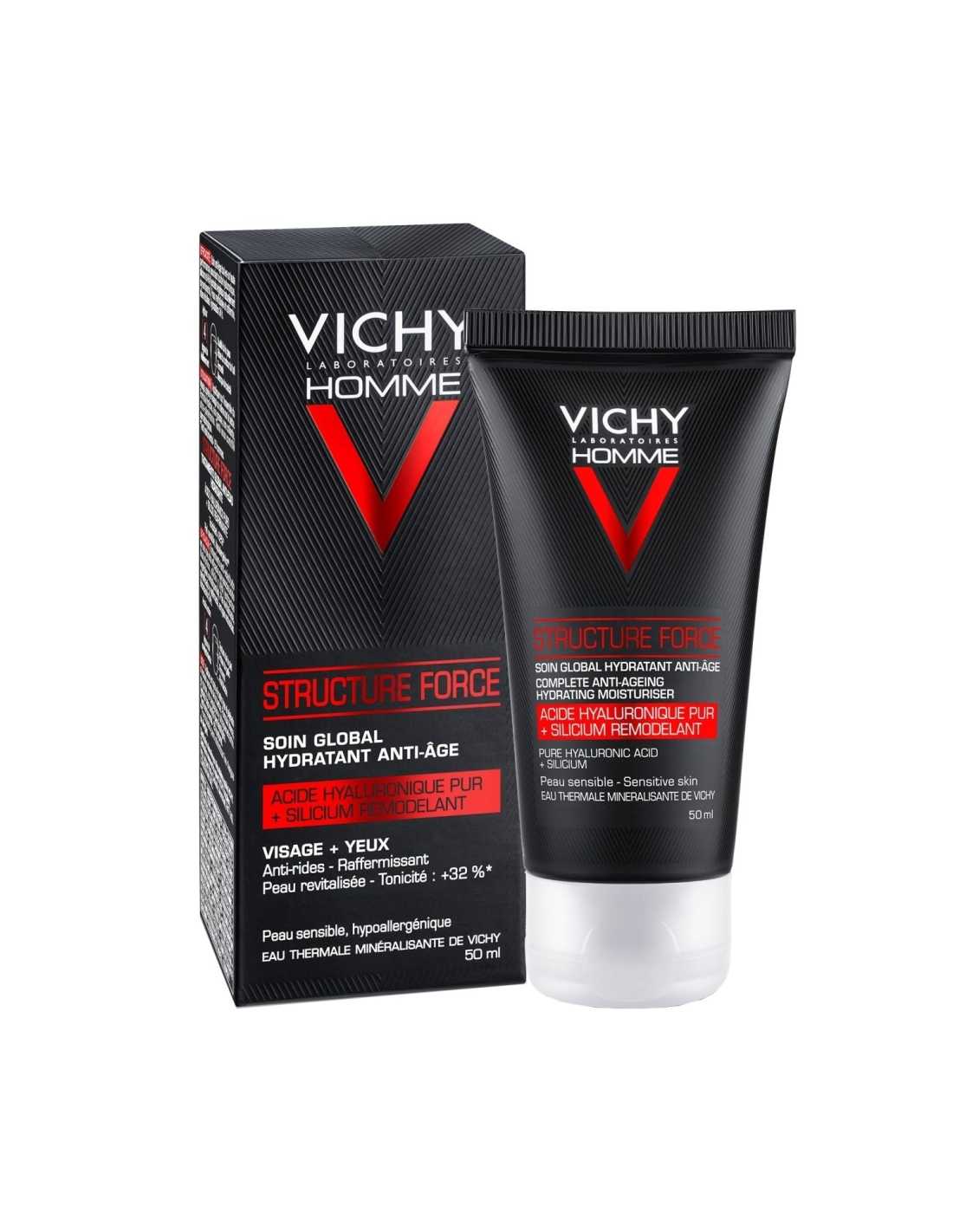 Vichy Homme Structure Force 50 Ml tratamiento para el cuidado facial hidratante y reafirmante, formulado especialmente para el rostro de pieles sensibles de los hombres, en concreto para después del afeitado, ya que contiene Agua Termal rica en Minerales y además, tiene efecto calmante gracias al Calcio dermoreparador. Su textura proporciona frescura a la piel y una hidratación duradera. Además de todos estos beneficios, también tiene propiedades antienvejecimiento, que combaten tanto las arrugas como las líneas de expresión causadas por el envejecimiento cutáneo.