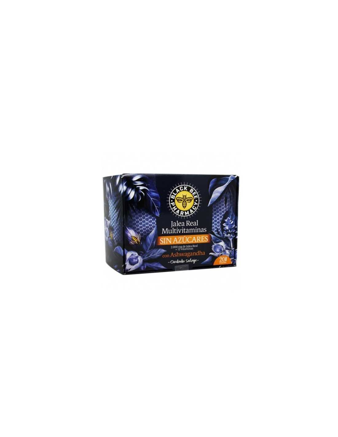 Complemento alimenticio Multivitaminas sin azúcares de Black Bee Pharmacy a base de Jalea Real, 12 vitaminas y Ashwaganda, planta que ayuda a mantener los niveles de energía. Esta indicado para fortalecer el sistema inmunitario y aportar un extra de energía y vitalidad sin azúcares. Para un extra de energía y vitalidad.