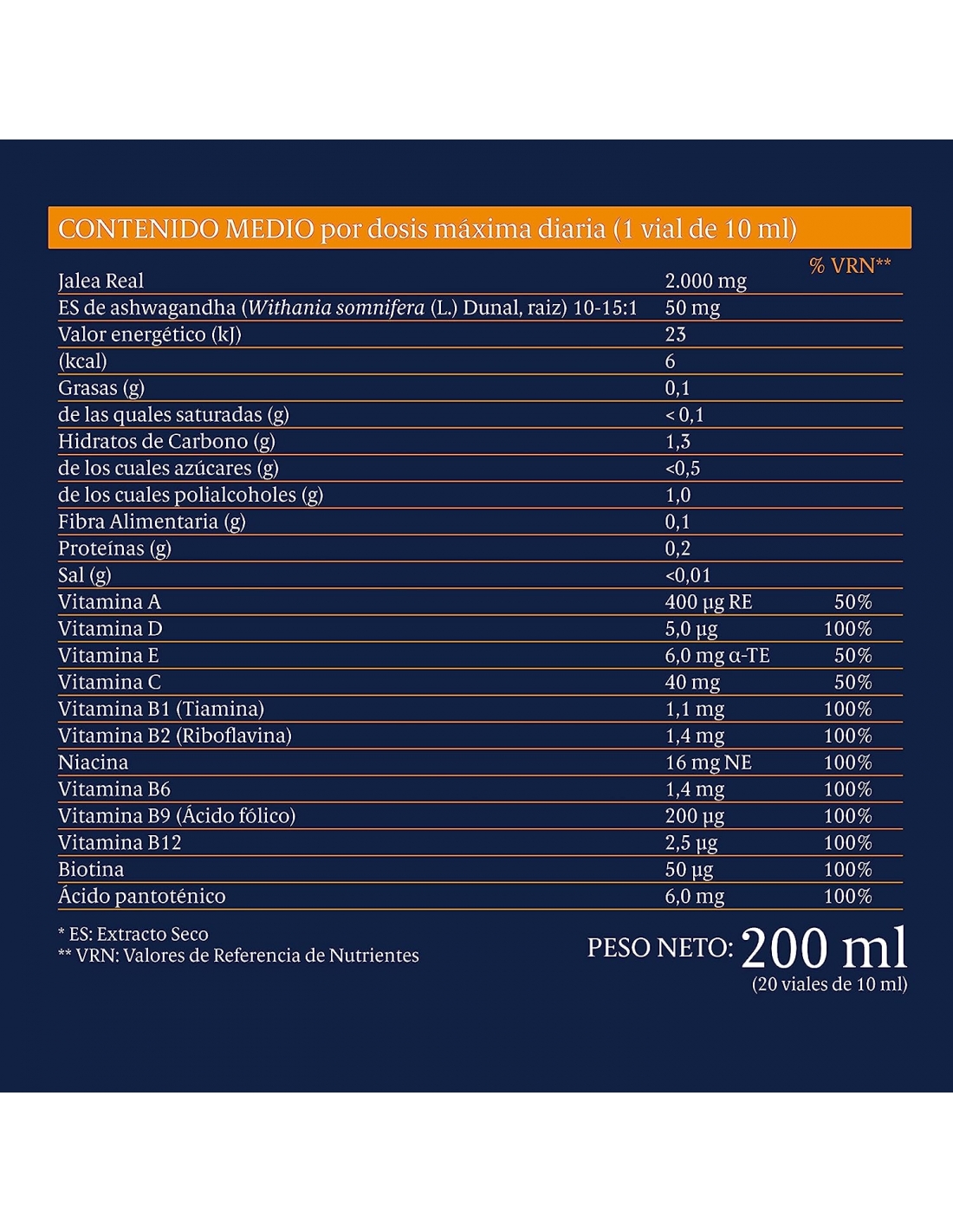Complemento alimenticio líquido a base de jalea real, ashwagandha y vitaminas. Sin azúcares. Agua, estabilizantes (glicerina vegetal, goma acacia), jalea real liofilizada, vitaminas (ácido L‐ascórbico, nicotinamida, D‐pantotenato de calcio, acetato de DL‐alfa tocoferilo, cianocobalamina, colecalciferol, clorhidrato de piridoxina, riboflavina, clorhidrato de tiamina, palmitato de retinilo, ác. Pteroilmonoglutámico (ác. fólico), D‐biotina), extracto seco de ashwagandha (Withania somnifera (L.) Dunal, raíz), aroma natural, conservador (sorbato potásico), espesante (carboximetilcelulosa sódica).